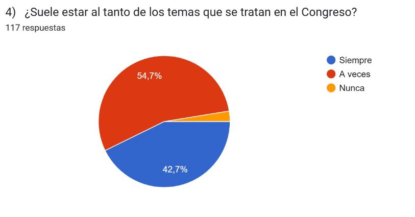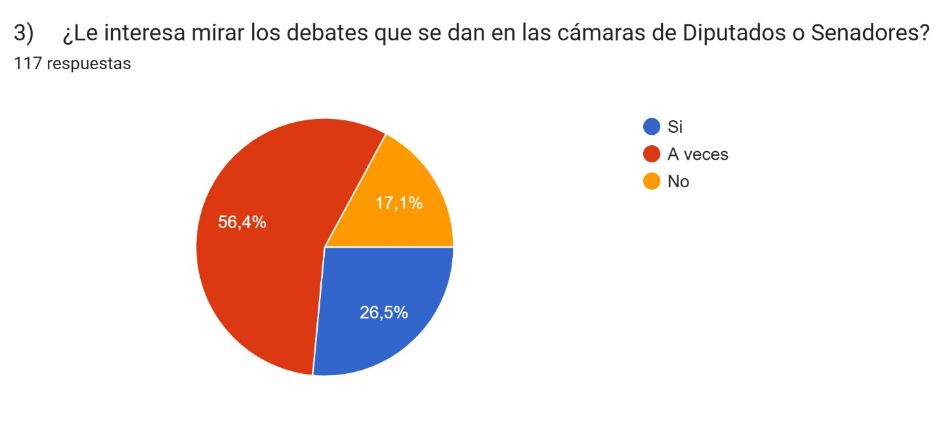 Un alto porcentaje de los encuestados se interesa a veces por los debates en el Senado o diputados que se presentan en los medios mostrando interés en todos los temas que se dieron en las últimas semanas (Aumento a Jubilados / Emergencia Pediatría Garraham/ Financiamiento Universitario / Discapacidad)
