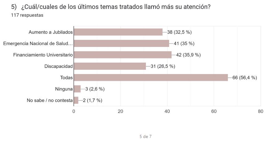 Desde la perspectiva hermenéutica de estos resultados puede abordarse desde la ética de la ciudadanía y de la responsabilidad pública. Los datos del CEDIAL muestran que la mayoría de los encuestados manifiesta interés por los debates parlamentarios vinculados a cuestiones sociales de alto impacto, tales como la emergencia pediátrica, las jubilaciones o el financiamiento universitario. En cambio, los conflictos mediáticos entre figuras del espectáculo prácticamente no suscitan interés. Ello revela una clara distinción entre lo que Cortina denominaría “temas de relevancia moral” y aquellos que se inscriben en la lógica del entretenimiento masivo.