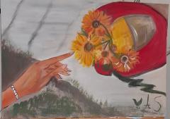 Sus obras nacen como necesidad de plasmar algo que late en su interior de la mano del deseo de expresar lo indecible. Sin detenerse en técnicas, juega con los colores y texturas hasta que la obra le cuenta por lo bajo que ya está dicho aquello que debía ser dicho. Así pinta, así escribe y así realiza su práctica cotidiana.