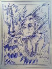 Jorge Daniel Chavez, artista visual argentino, nacido en Avellaneda. Siempre dedicado a nuestra cultura popular. Estudió publicidad y se dedicó muchos años al teatro, donde toma inspiración para muchas de sus obras, también sus temas son el tango y el gaucho. 3)”La madre patria”. Técnica: bolígrafo sobre cartulina. Medidas; 21 x 24 cm.